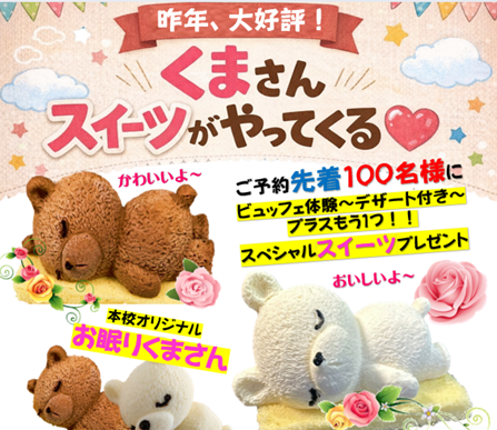 ご予約先着100名様にかわいいスイーツ 本校オリジナル『お眠りくまさん』をプレゼント!! ご予約お待ちしております。