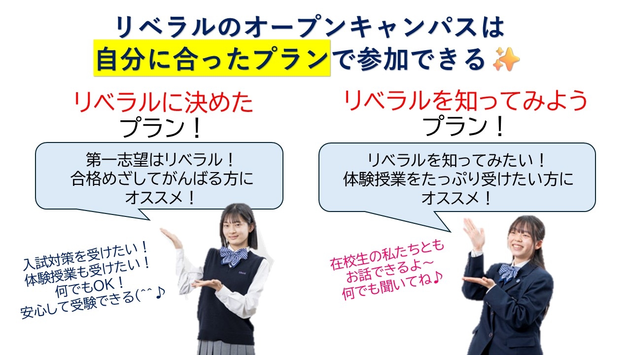 学校説明会(入試について・授業料等説明・特待制度の説明など)・体験授業・入試対策講座(国語・数学・英語)・面接対策講座・個別相談・制服試着体験などのイベントを行います♪