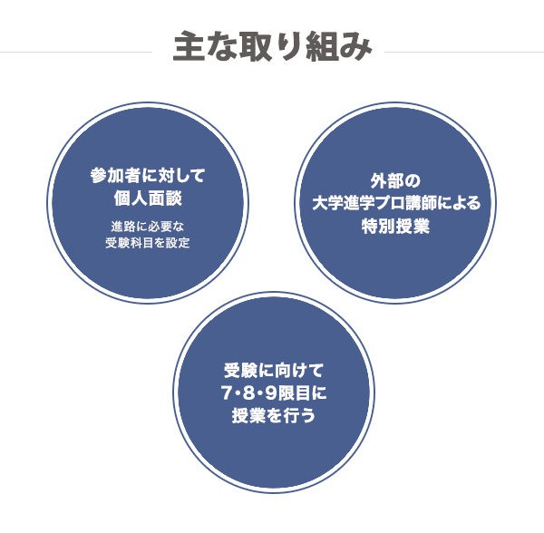 外部の大学進学プロ講師が指導する勉強塾。特別授業として一人ひとりの志望校に合わせて受験対策を行います。